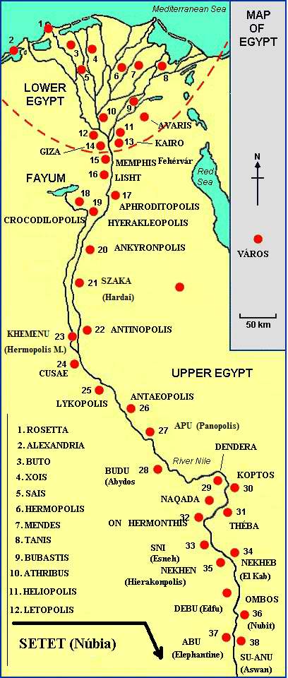 Alább következtek, mindenütt a jobbparton, Tukau és Paharnub, Duf /Tuph?/(Antaeopolites) on/honában, a balparton Baar (Hypselis) on/honában Sasotpu (Sótp) vára és a felső Jotef (Jotef khont, Lykopolites) on/honában a jelentékeny Sziut (Osziut) városa. Odább az alsó Jotef (Jótef poh’u), melynek fővárosa a fáraók idejében Kuszit (Khusai) volt. Hermopolisz régi neve Unu /Khemenu/(a nyolc isten városa) volt, s Un on/honában, a ma is Bahr Juszuf-nak nevezett csatornához közel feküdt. Egyiptom egyik legrégibb városa volt. Itt aratta Horus egyik nagy diadalát Széth fölött. Mintegy száz kilométerre délre Memphistől található ("Sakál") hon, fővárosa Szaka. Memphis a delta felett kb. 40 km-re található. Neve magyar fordításban: /mint a magyar fővárosoké!/ Fehérvár / Gyulafehérvár, Székesfehérvár, Nándorfehérvár/. Megemlíteném még a 15. hon-t Un-t ("Vadnyul"), ismertebb városa Khemenu.