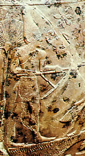 One key feature we should note about the pyramid building is that the quarries for the finest limestone were on the opposite side of the Nile from the pyramid sites, and that the quarries for all the granite were far up the Nile at Aswan (rough internal blocks for the pyramids were quarried nearby). This means that the best time to move all that rock to the pyramid sites was during the season of the Flood, when the Nile would be the widest and deepest. Indeed, an essential part of all pyramid architecture was the dock at the edge of the desert, i.e. at the high water mark, with a causeway leading up to the pyramid foundation. It is not hard to imagine the government of Egypt impressing all the farmers idled by the Flood into a great effort to move a year's worth of stone up and/or across the Nile. The rest of the year, the more skilled stone masons would work to place the blocks, or would quarry the rougher, interior stone for the pyramids adjacent to the sites. In recent years, the village and burials of the pyramid workers have been discovered at Giza. As might be expected, the bones show evidence of heavy labor.