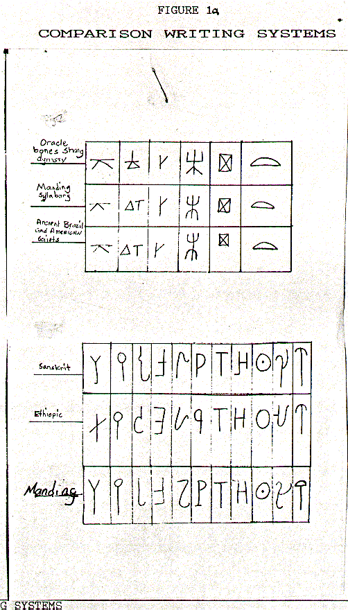 A jobbra látható FIGURE 1a ábrán írásjeleket látunk a Föld különböző pontjairól. a 4. jel, amely egy kétirányú villát formáz (fa), megtalálható a turáni leletnél is. Az még csak elképzelhető, hogy a föld két írásfeltalálójának pont ugyanaz a forma jut eszébe, de , hogy 5 helyen is....(Amerika, Nyugat-Afrika, Kína, Turkmen A jelet legutóbb a Hawai szigeteken láttam...)