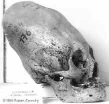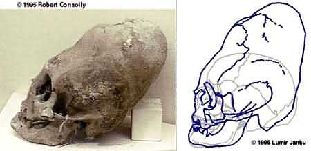 When some of these pictures (the first two) were posted on CompuServe more than year ago, the majority of people assumed that they represented an example of binding of the head, well known to be in fashion in ancient Nubia, Egypt and other cultures. The problem with this theory is that the inside of the cranium of the mentioned skulls, although elongated and with a back sloping, flattened forehead, have the same capacity as normal human skulls; the only difference is the shape achieved by frontal and side deformations. They are actually more similar to the first type of skull (premodern) with the rounded back, than the conehead type. The cone-shaped types of skull are not found amongst the usual skull-binding samples.