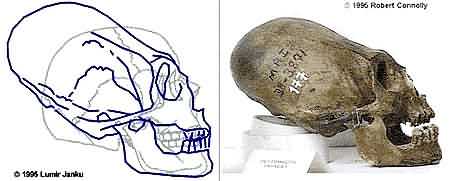 The first skull presents problems of its own. The frontal part of the skull seems to belong to an individual of the pre-Neanderthal family, but the lower jaw, though more robust than modern human type, has a modern shape and characteristics. The shape of the cranium does not have any comparison with the Erectus, Neanderthal types, nor the modern human type. Some minor Neanderthal characteristics are present, as is the occipital ridge on the bottom back of the skull and the flattened bottom of the cranium, other characteristics point more tovards Homo Erectus. The angle of the cranial bottom is, though, unusual. We cannot exclude the possibility of a deformed individual in this case, but it is highly unlikely that the angle of the frontal part would require a modification of the lower jaw in the process of growing to resemble modern human types with their projected chin rim. The answer seems to be that the skull belongs to a representantive of an unknown premodern human or humanoid type.